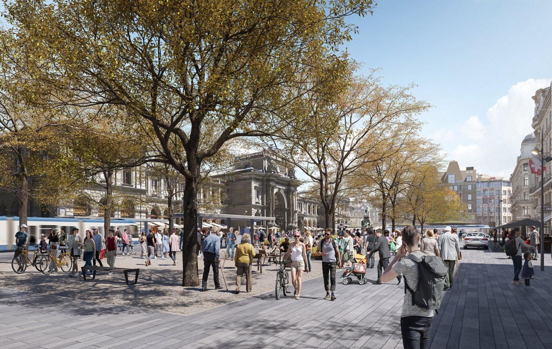 Der Hauptbahnhof wird dabei zu einem Ort, an dem sich vielfältige Verkehrsströme reibungslos organisieren, grosszügige Freiräume entstehen und Grünräume die Stadtmitte neu prägen. Kernelement ist ein attraktiver, autofreier Bahnhofplatz.