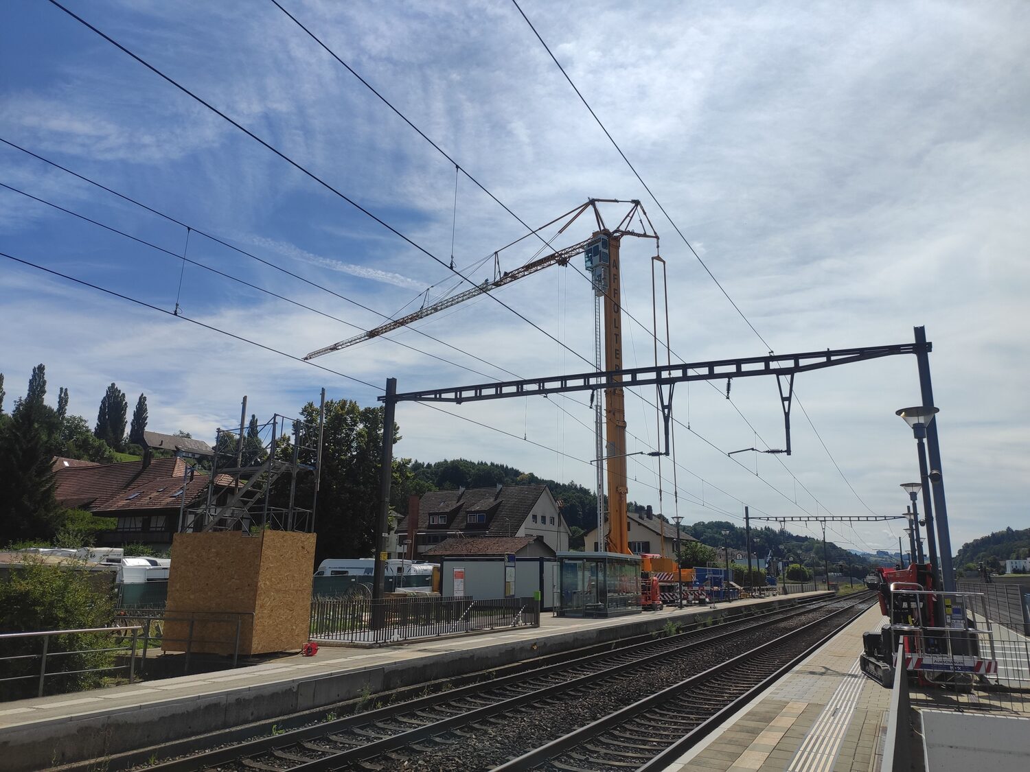 Die gesamten Umbauarbeiten (Gerüstbau, Abbruch und die Montage des neuen Holzdachs) erfolgten während Totalsperre mit abgeschalteter Fahrleitung und unter Einhaltung der aktuellen Sicherheitsbestimmungen und Weisungen der SBB. Die Abdichtungs-, Spengler- und Seilsicherungsarbeiten auf den neu erstellten Dächern erfolgten unter normalem Bahnbetrieb.