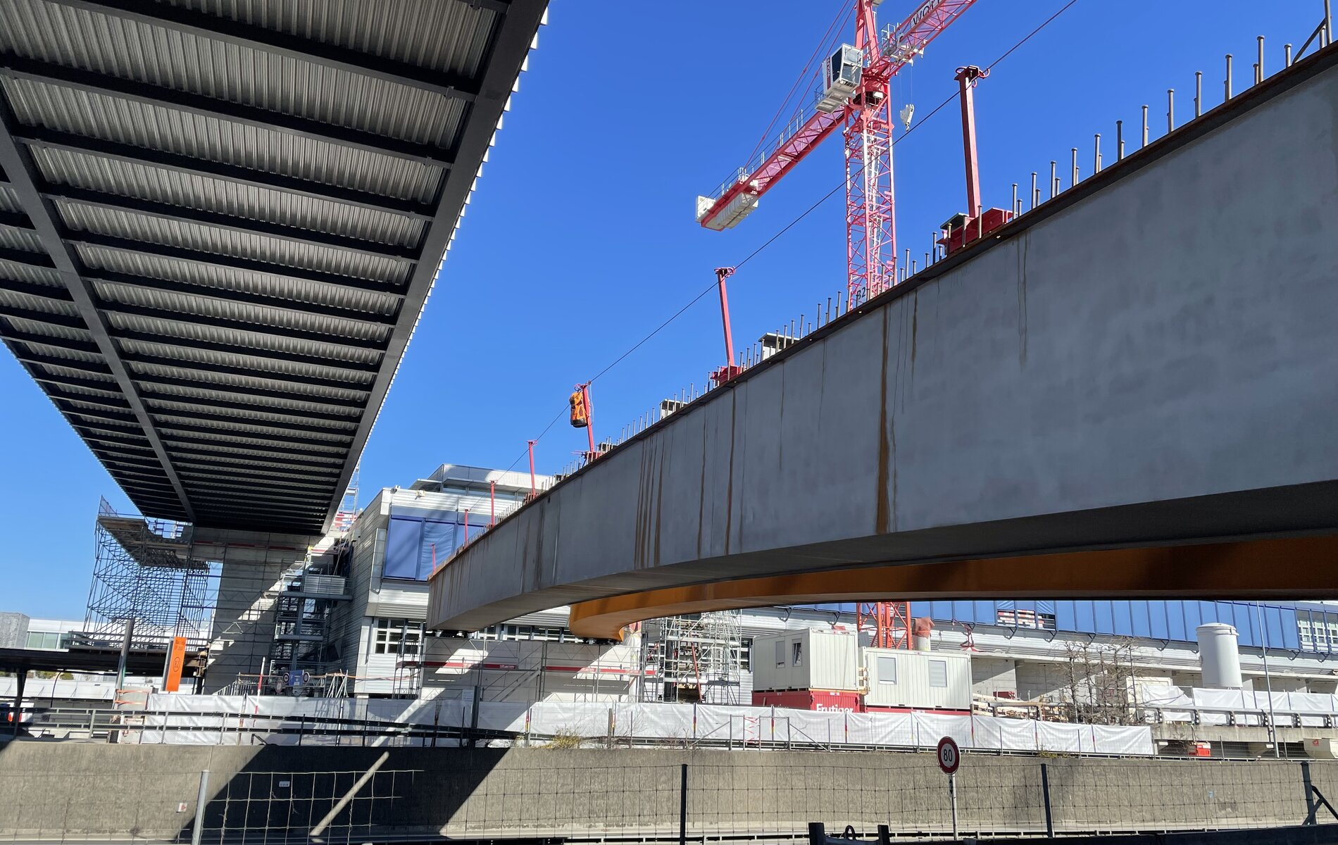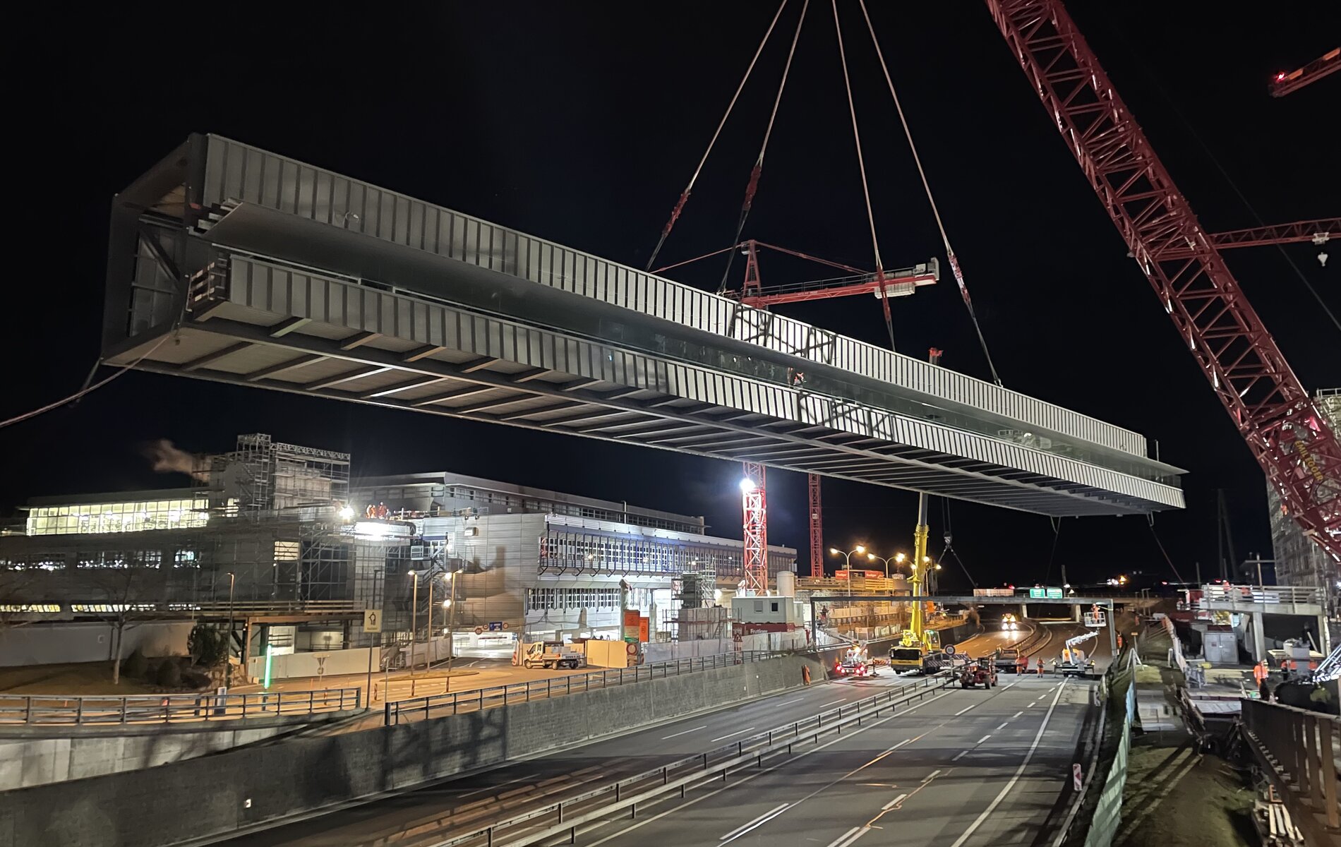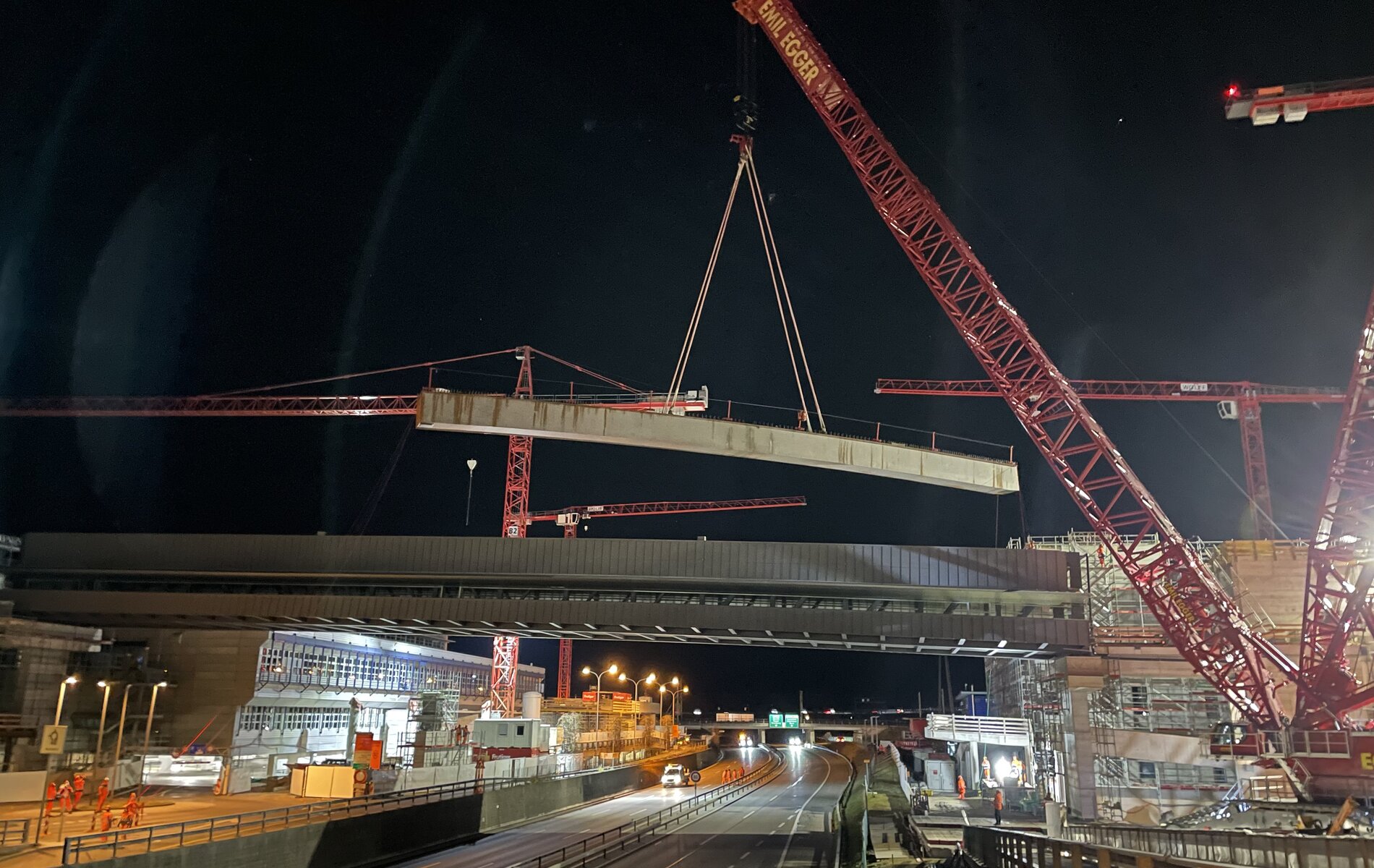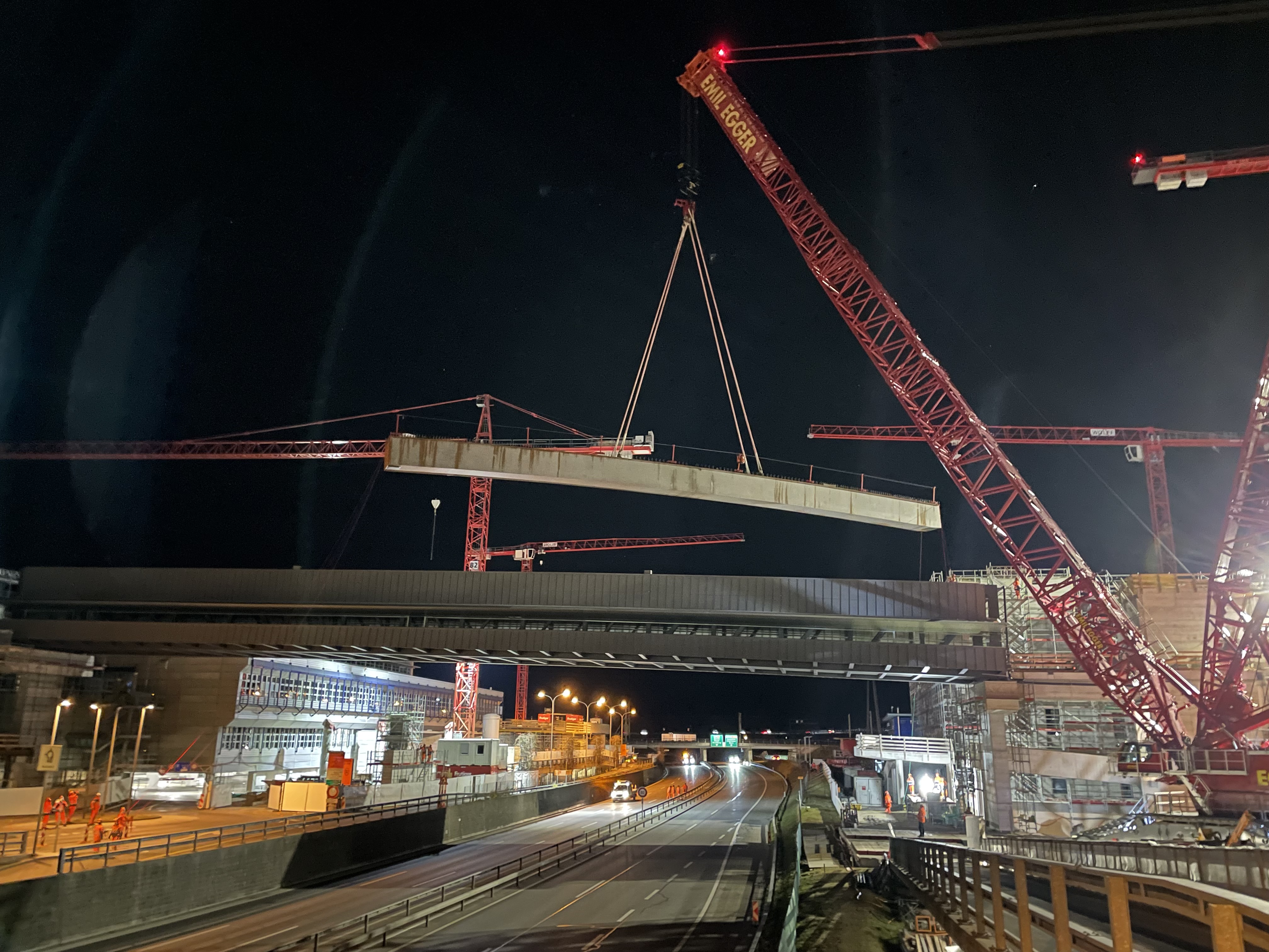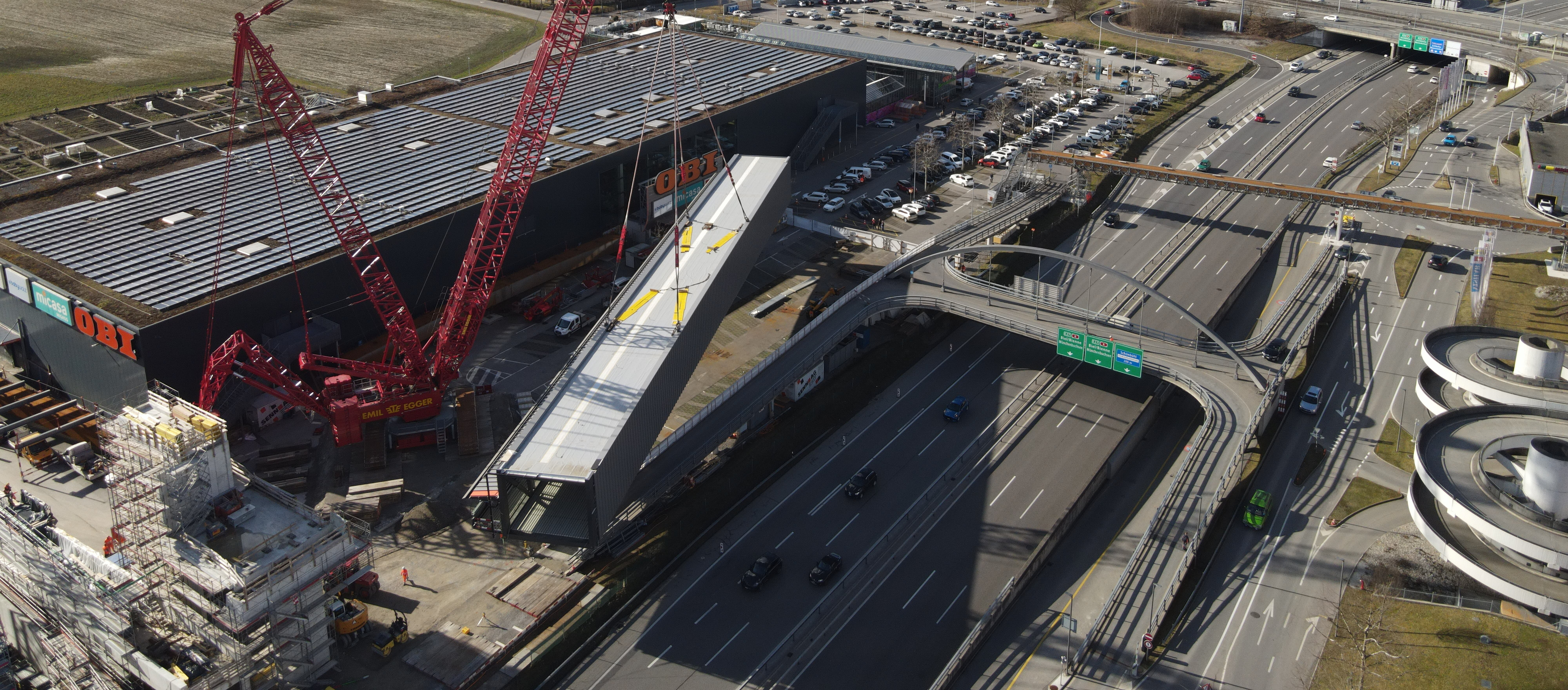Am Wochenende vom 25. bis 27.02.2022 konnten die Hauptspannweiten der beiden Brücken über der Autobahn mit einem der grössten Raupenkrane (Liebherr LR 11000) Europas nach Verschiebungen aufgrund des stürmischen Wetters erfolgreich eingehoben werden. Die weiteren Ausbauarbeiten aller Brücken der Erschliessung dauern noch bis Ende 2022.