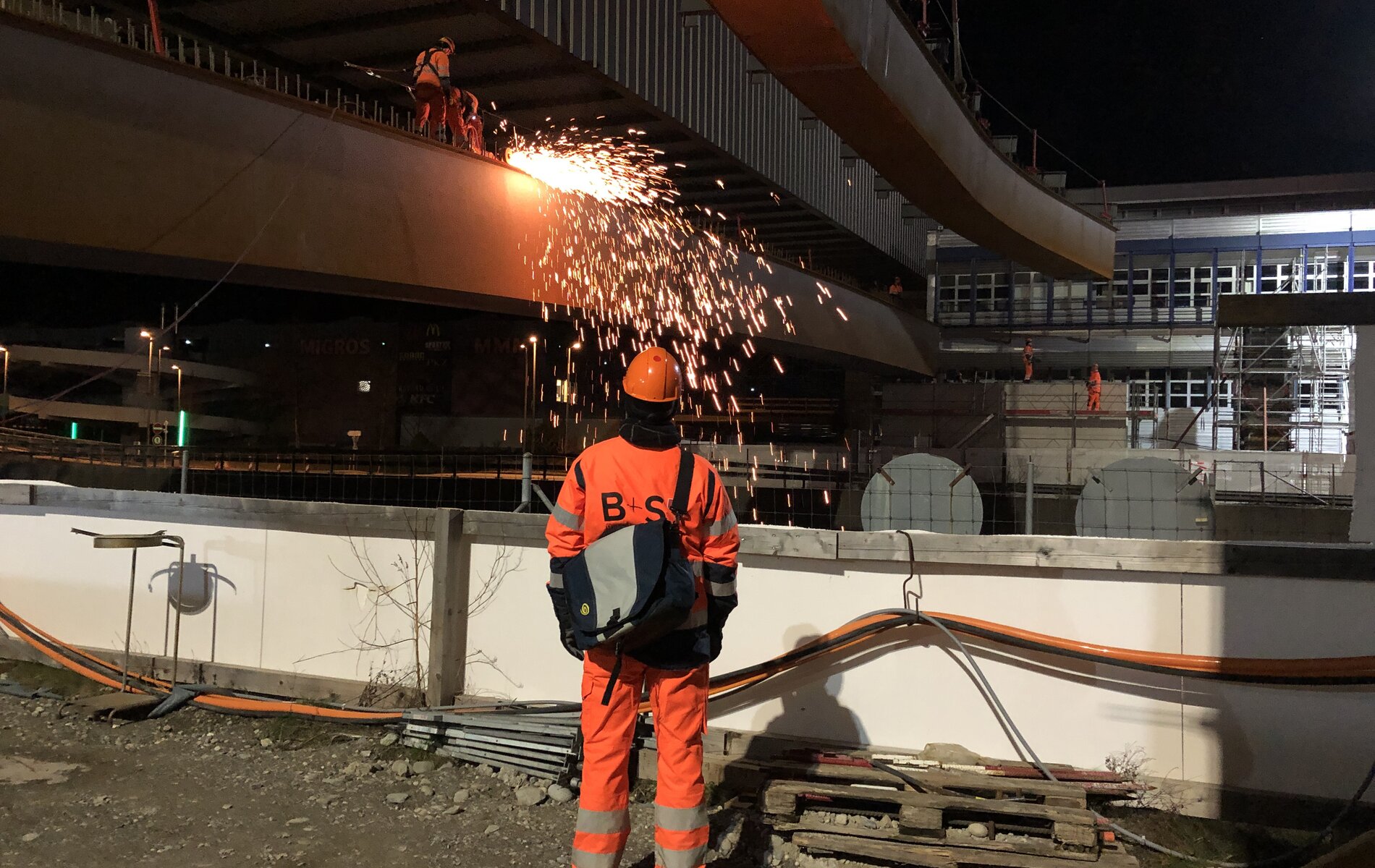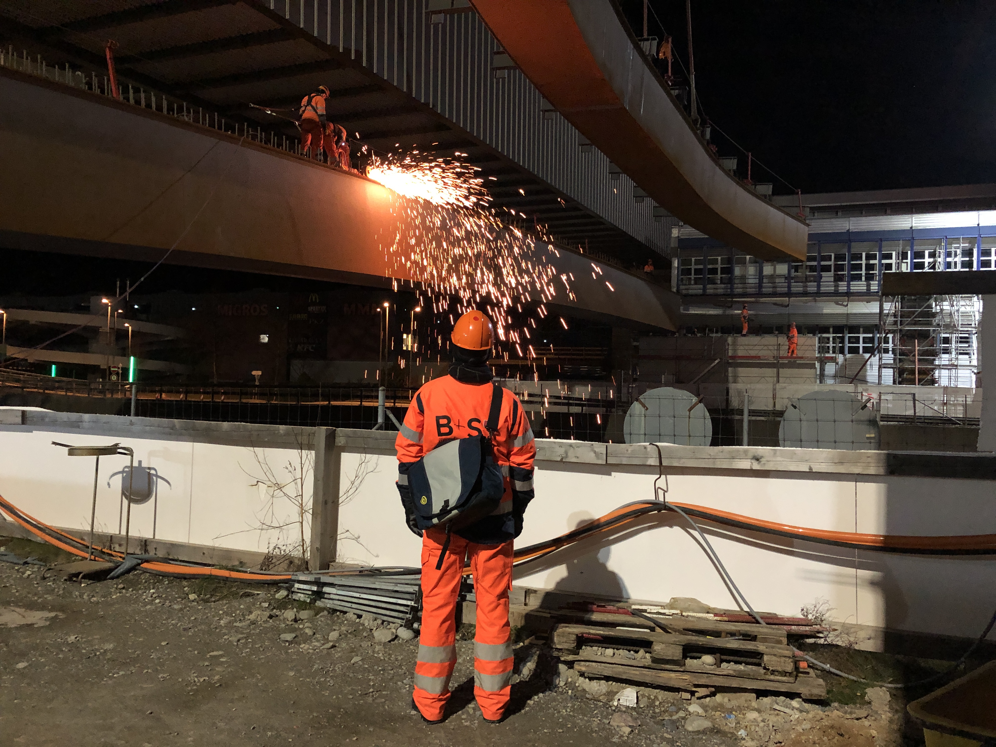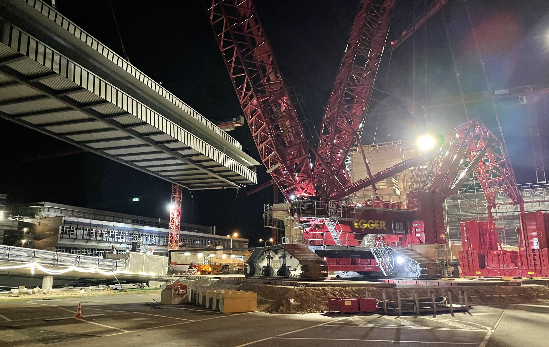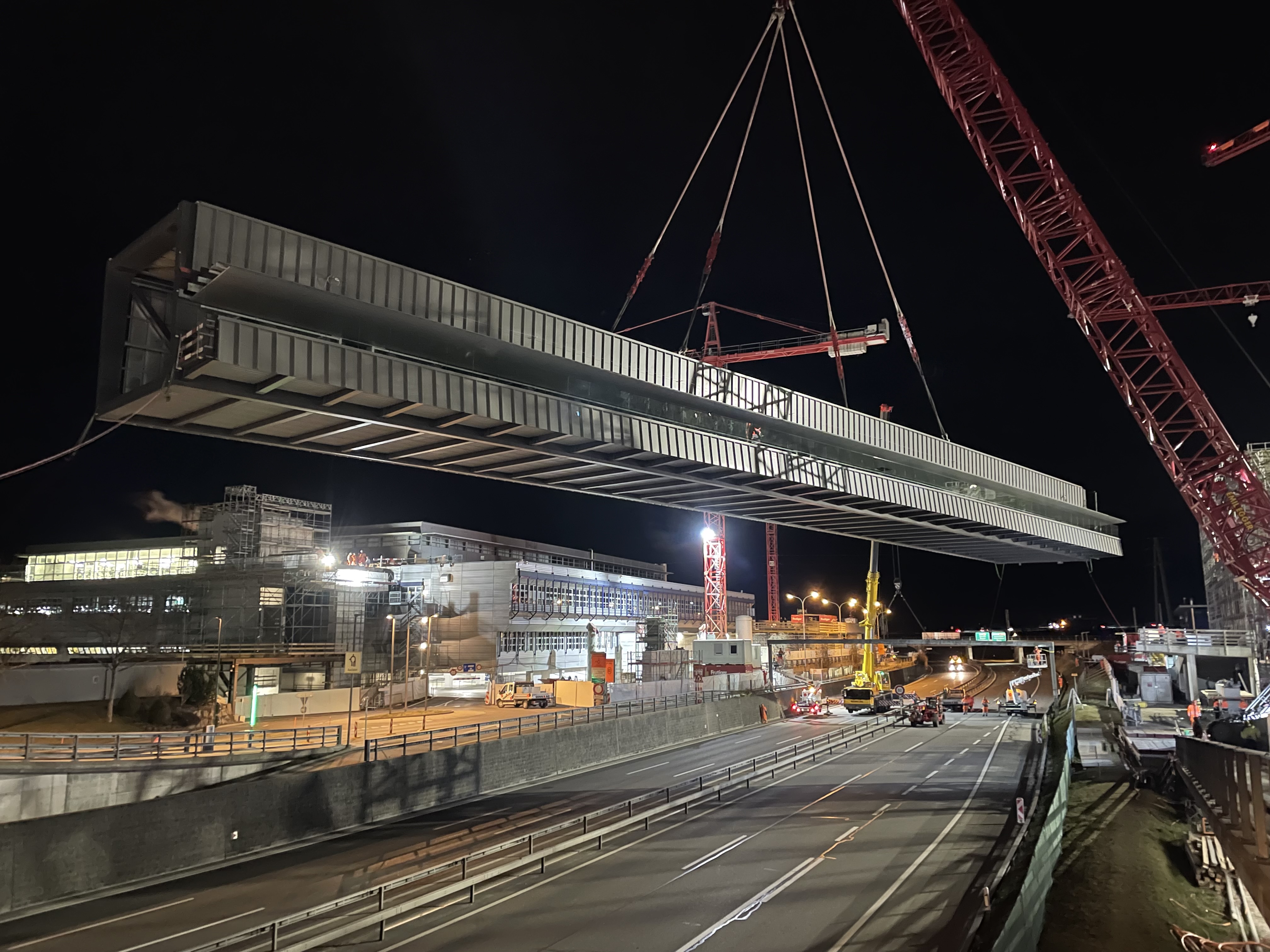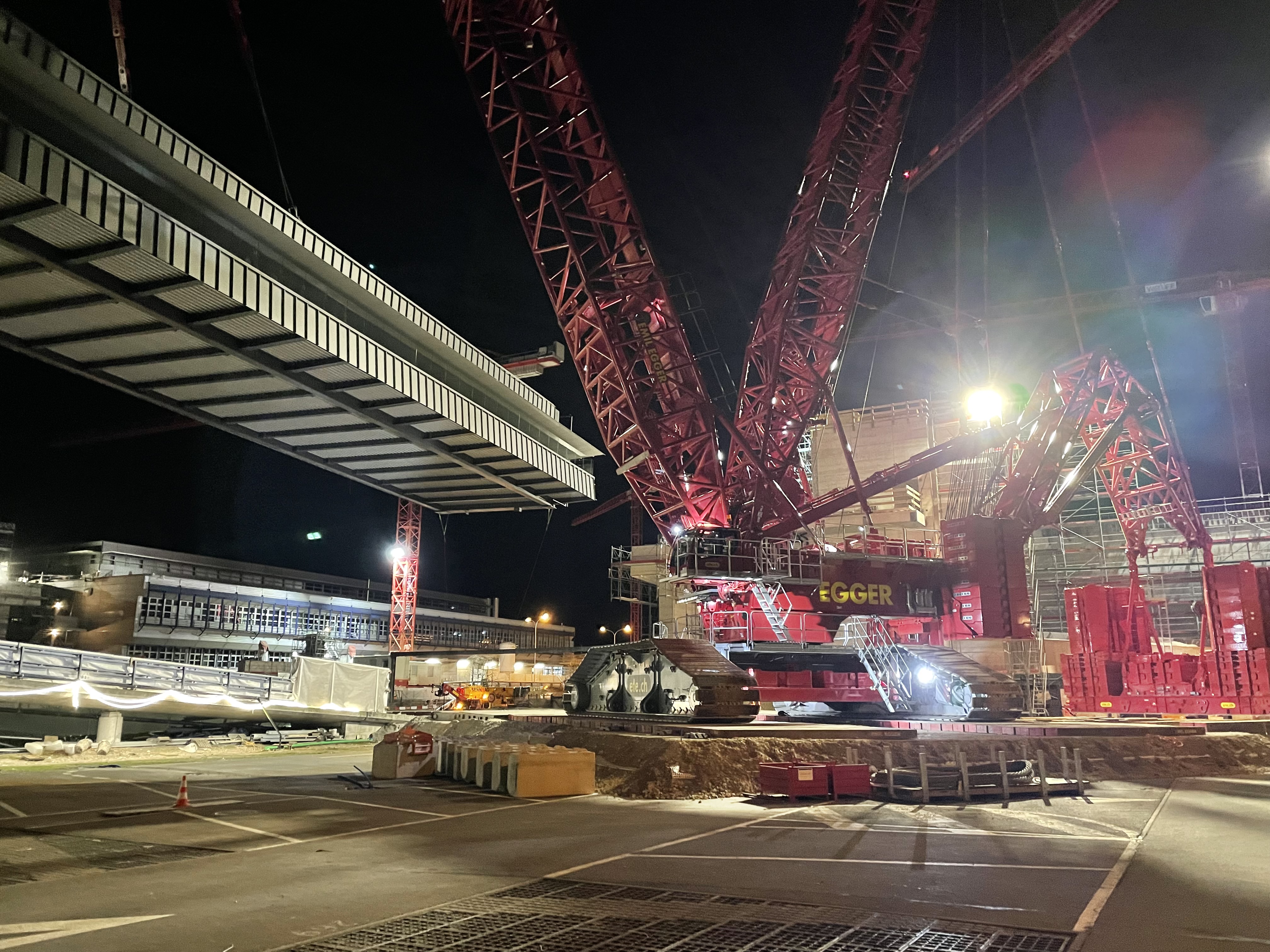Am Wochenende vom 25. bis 27.02.2022 konnten die Hauptspannweiten der beiden Brücken über der Autobahn mit einem der grössten Raupenkrane (Liebherr LR 11000) Europas nach Verschiebungen aufgrund des stürmischen Wetters erfolgreich eingehoben werden. Die weiteren Ausbauarbeiten aller Brücken der Erschliessung dauern noch bis Ende 2022.