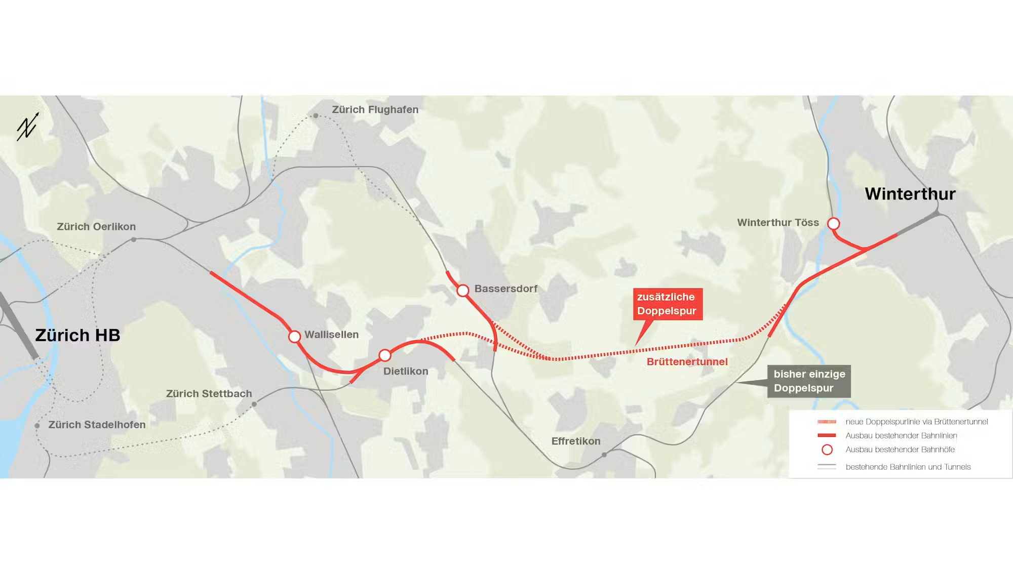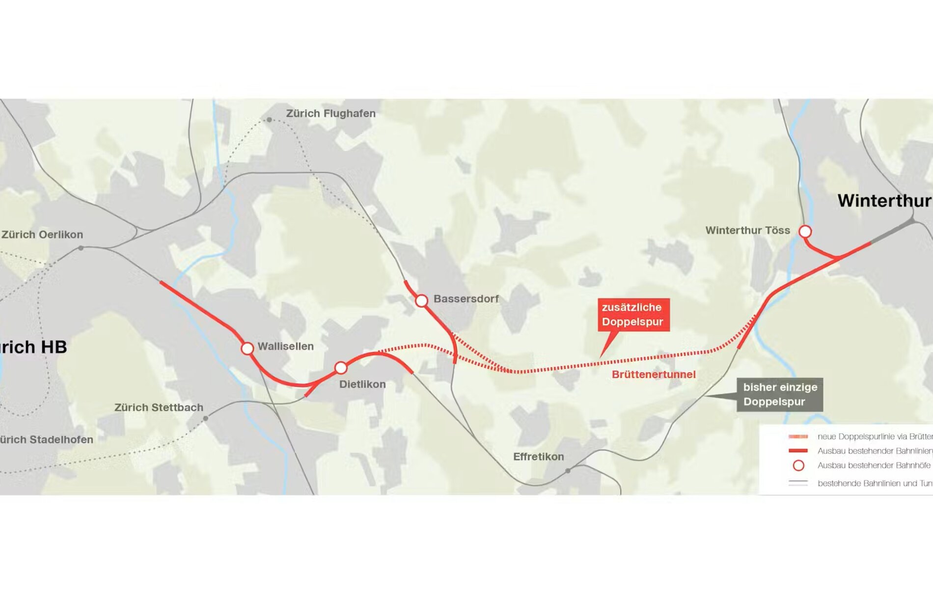 🔹 Neubau der rund 580 m langen Überwerfung Brüelwise, damit Züge von Wallisellen Richtung Zürich Oerlikon kreuzungsfrei verkehren können;