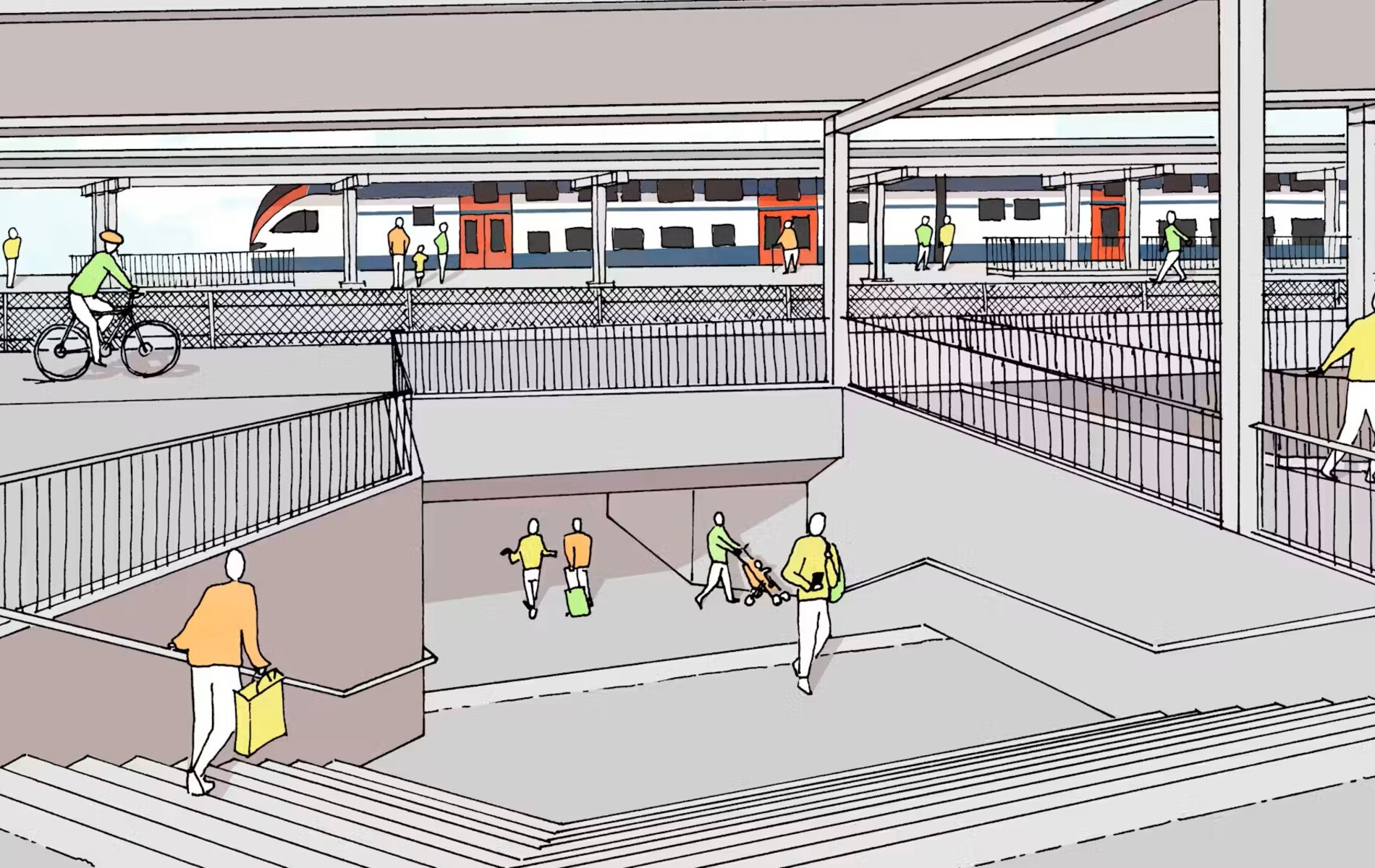 🔹 Ausbau des Bahnhofs auf vier durchgehende Gleise mit Verbreiterung der Mittelperrons und Anpassung aller Zugänge zu den Perronanlagen;