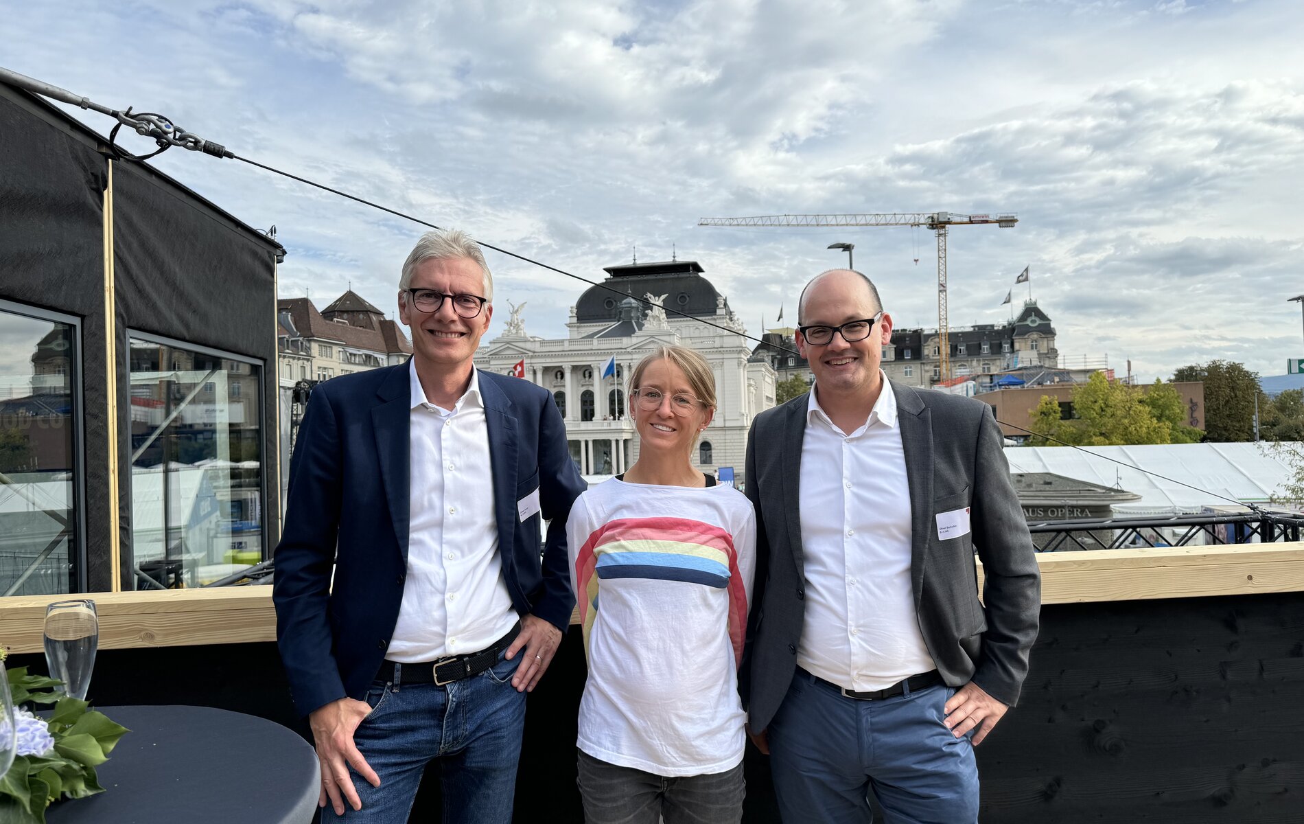 [Hinweis zu Personenfoto: ehemalige Radsport-Weltmeisterin Emma Pooley flankiert von Cäsar Graf (links), CEO, und Oliver Bachofen, Mitglied der Geschäftsleitung.]