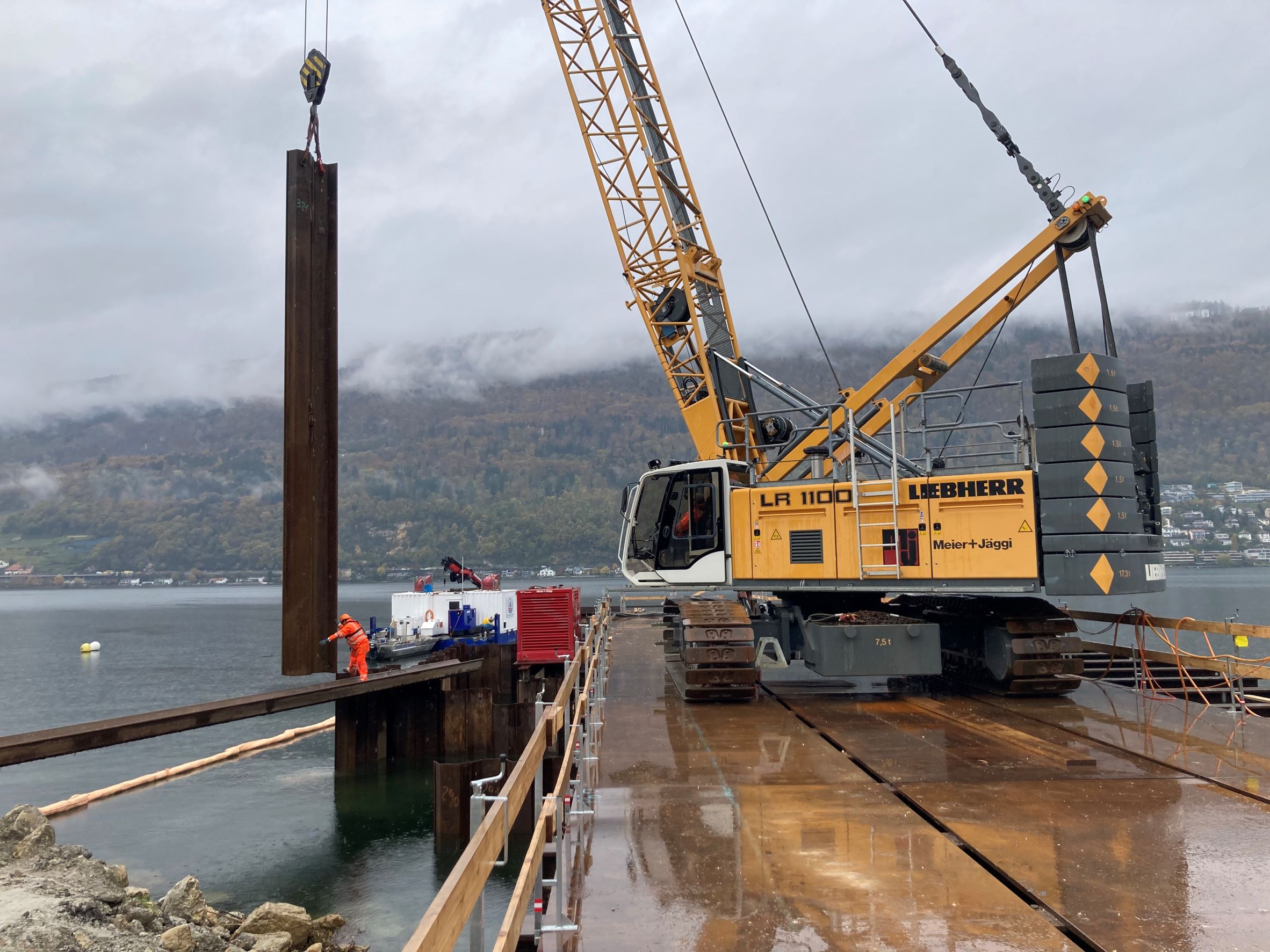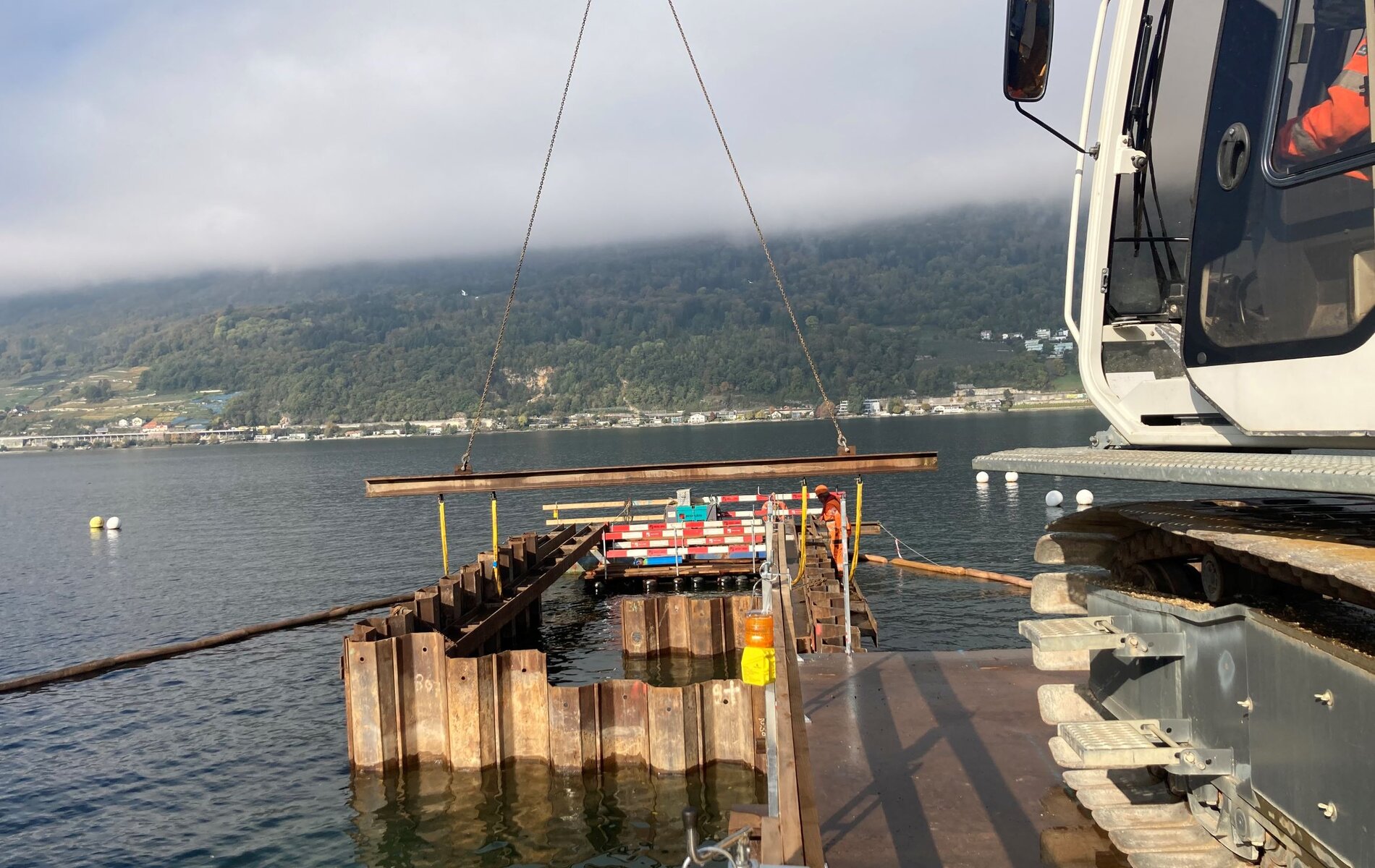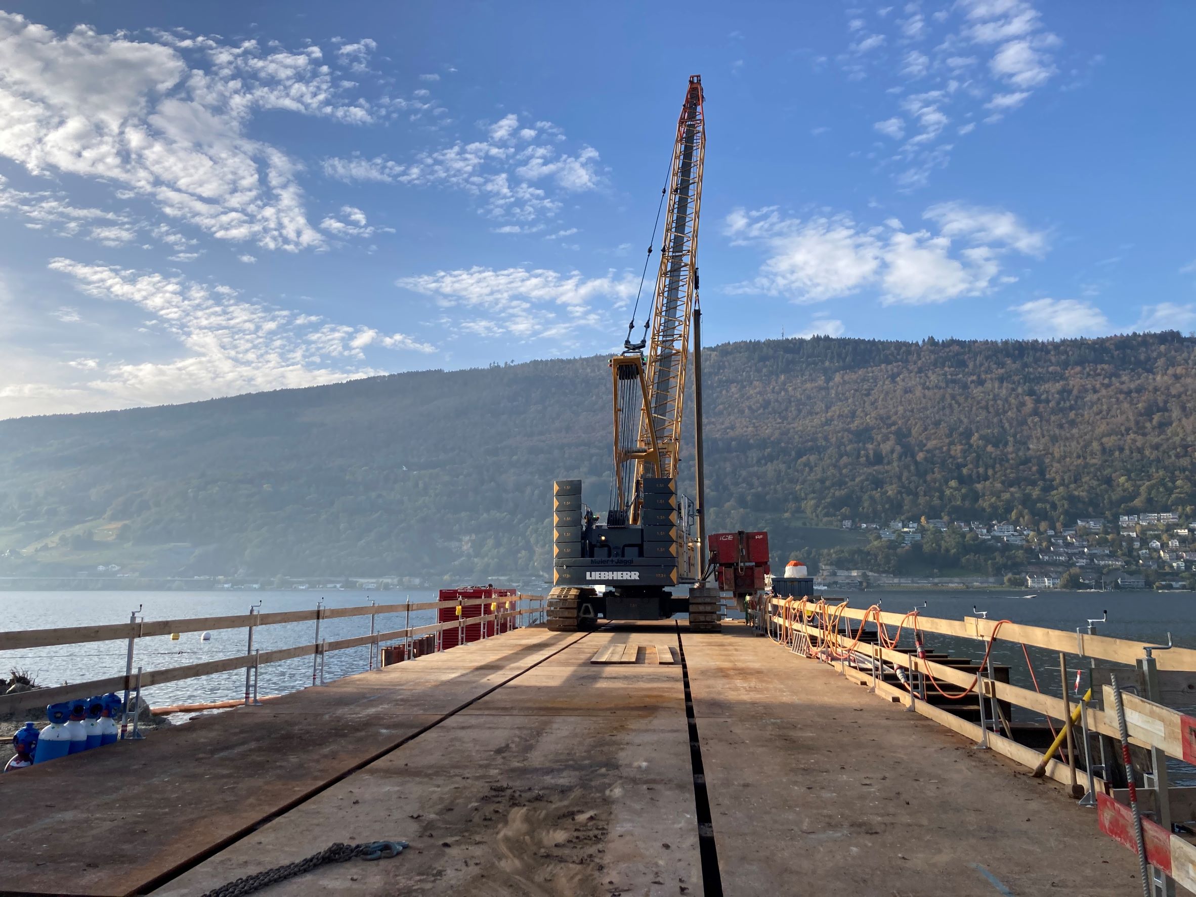 Die B+S AG und Meier+Jäggi AG haben in enger Zusammenarbeit ein System realisiert, welches den Einbau der Wände über Kopf ohne den Einsatz einer Pontonanlage erlaubt. Die Lagerung des Seilbaggers inkl. Hydrohammer (ca. 125 t) erfolgt trotz schwierigster geologischer Verhältnisse im See auf den Spundwänden selbst.