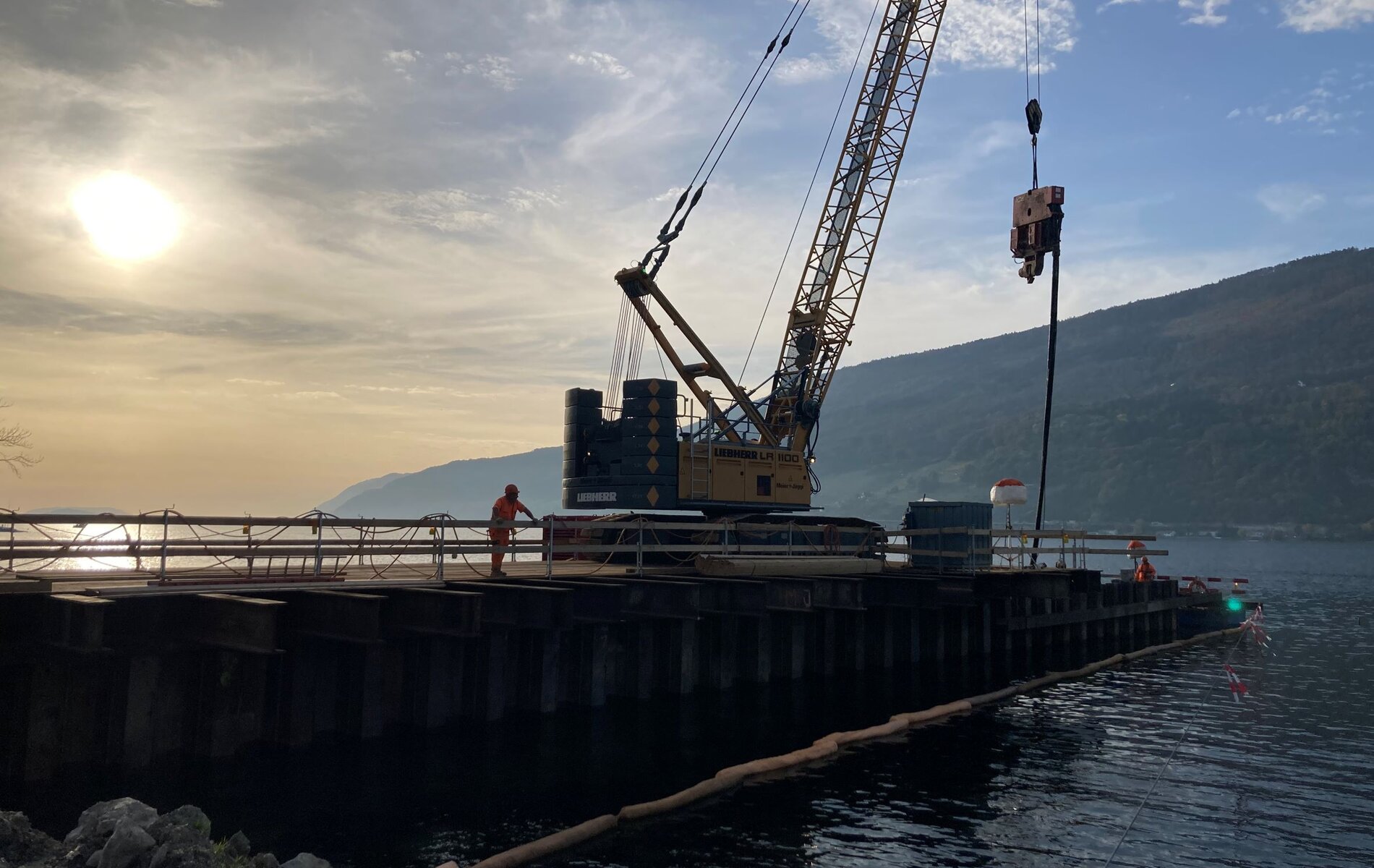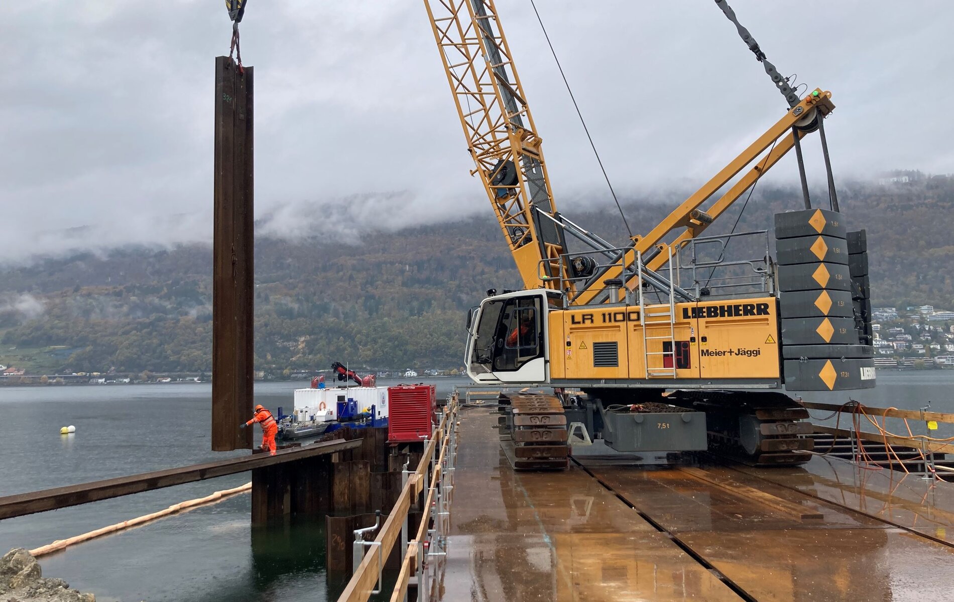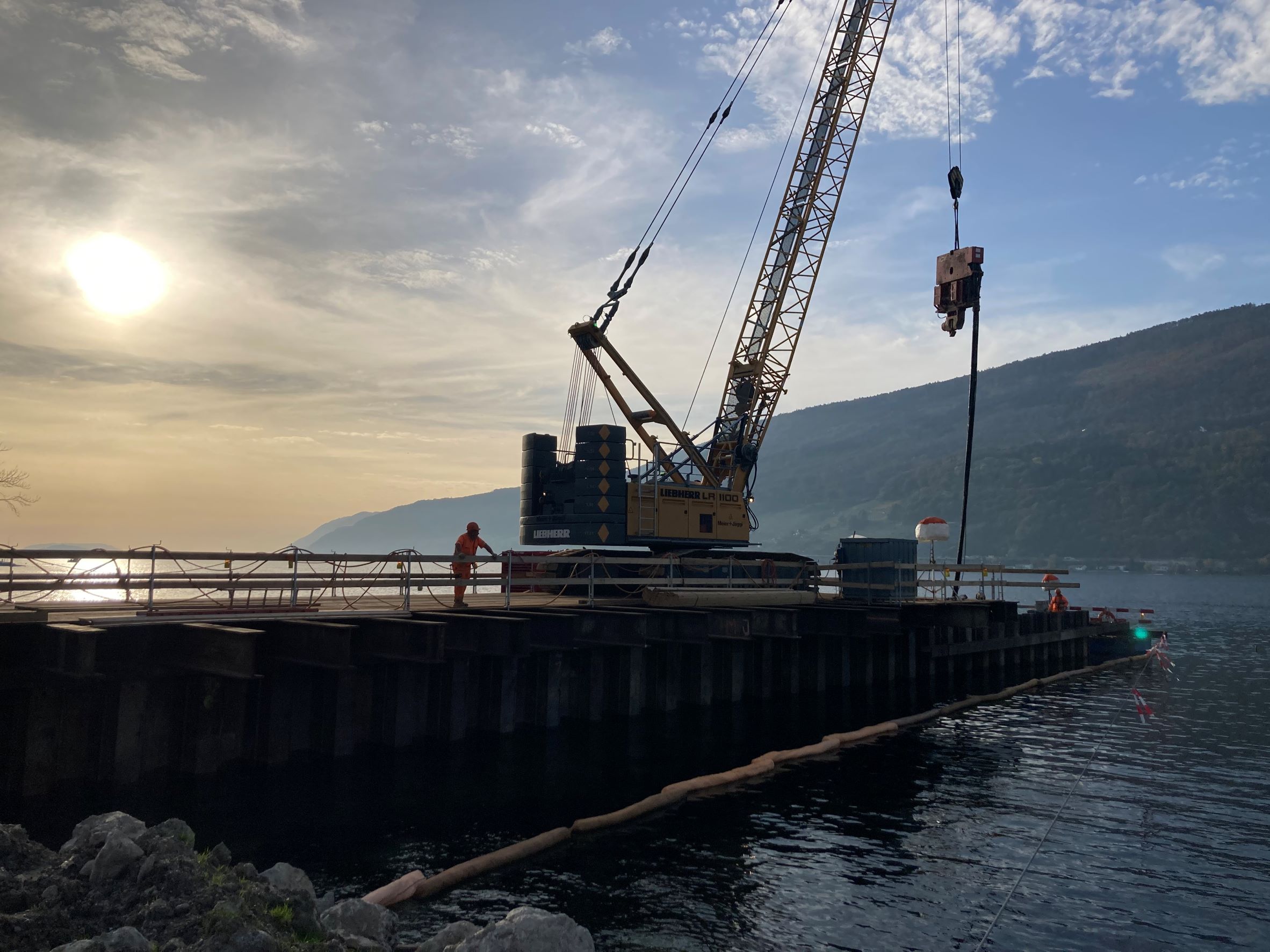 Die B+S AG und Meier+Jäggi AG haben in enger Zusammenarbeit ein System realisiert, welches den Einbau der Wände über Kopf ohne den Einsatz einer Pontonanlage erlaubt. Die Lagerung des Seilbaggers inkl. Hydrohammer (ca. 125 t) erfolgt trotz schwierigster geologischer Verhältnisse im See auf den Spundwänden selbst.