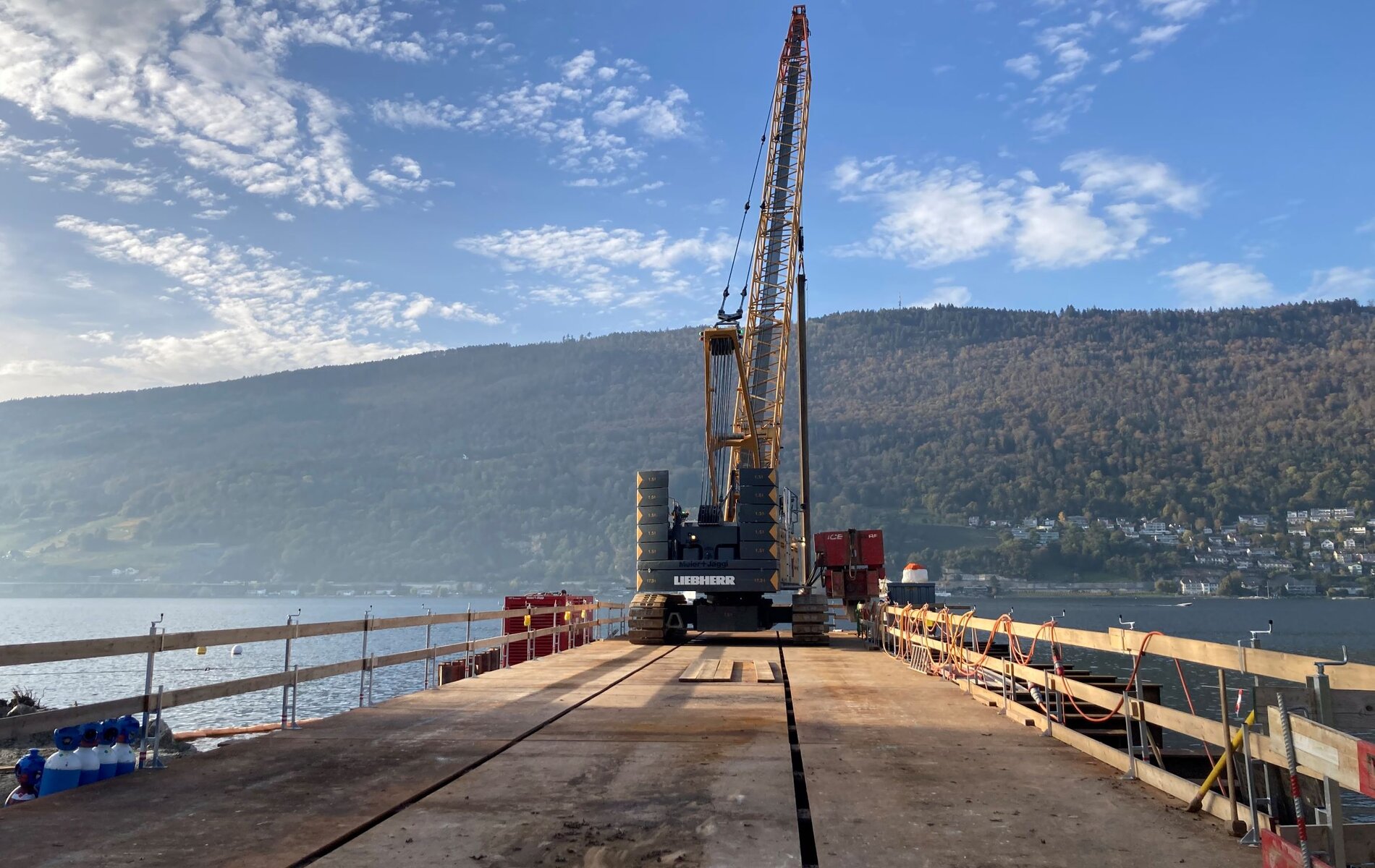 Im Rahmen der Erneuerung des Seewasserwerks Ipsach (Trinkwasserproduktion für die Stadt Biel) werden aktuell Spundwände im Uferbereich des Bielersees versetzt. Der Spundwandkorridor erstreckt sich schliesslich über 65 m in den See hinein. Im Schutz des Korridors erfolgt im Anschluss der Aushub unter Wasser. Die Bezugsleitungen für das Seewasser werden später vorfabriziert, mit einem Schiff in den Korridor eingeschwemmt und abgesenkt, bevor der ausgehobene Seegrund über den Leitungen wieder angelegt wird.