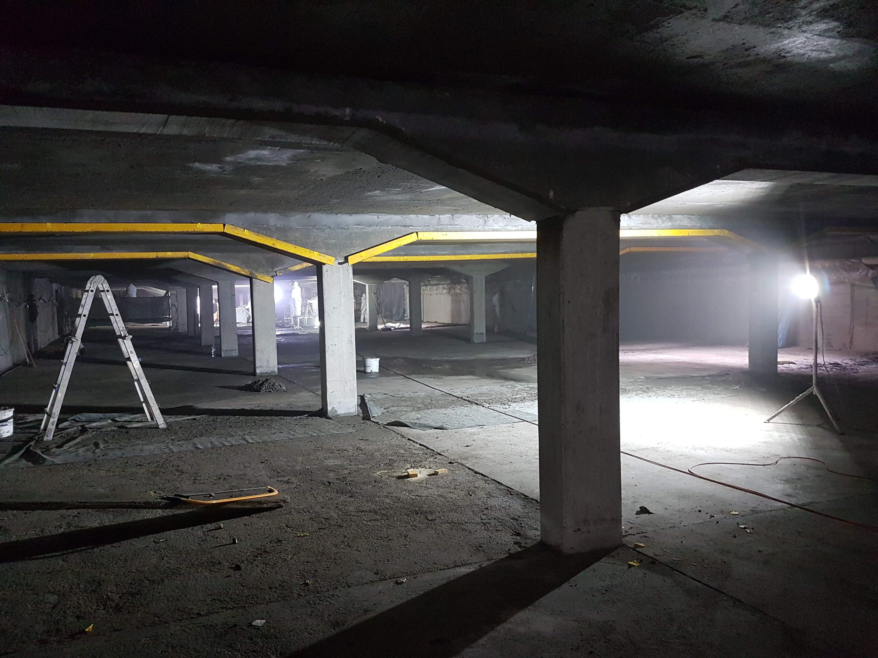 - Betoninstandsetzung in der Halle mit Spritzmörtelauftrag an der Deckenuntersicht (Brandschutz), Karbonatisierungsschutz OS4.